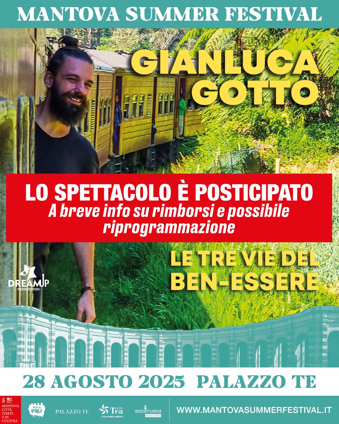 Si comunica che a causa delle pessime condizioni meteo lo spettacolo di Gianluca Gotto in programma stasera, 28 agosto, a Palazzo Te per il Mantova Summer Festival verrà posticipato.