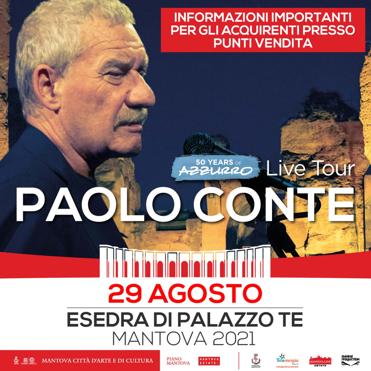 PAOLO CONTE A PALAZZO TE, MANTOVA Comunicazione per gli acquirenti dei biglietti presso Punti Vendita Chi avesse acquistato presso BoxOffice o altri Punti Vendita Ticketone è invitato a scrivere alla mail info@shiningproduction.com per avere tutte le informazioni sul ricollocamento del posto acquistato. In alternativa è possibile recarsi presso l’INFO POINT che sarà attivo a Palazzo Te il giorno dell’evento …