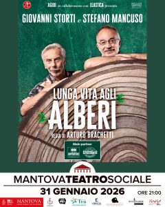 Il 31 gennaio Giovanni Storti e Stefano Mancuso saranno sul palco del Teatro Sociale di Mantova con “ALBERI - Tutto quello che avreste voluto sapere ma non avete mai osato chiedere”. Uno spettacolo teatrale che vuole svelare i misteri del mondo vegetale attraverso un viaggio appassionante e sorprendente con una coppia d’eccezione: Giovanni Storti è un curioso viaggiatore accompagnato dal Professor Stefano Mancuso, la sua guida sapiente e illuminata. Il loro viaggio è raccontato dalla regia visionaria e poetica di Arturo Brachetti che trasformerà la narrazione in magia, coinvolgendo il pubblico in una atmosfera di grande suggestione.